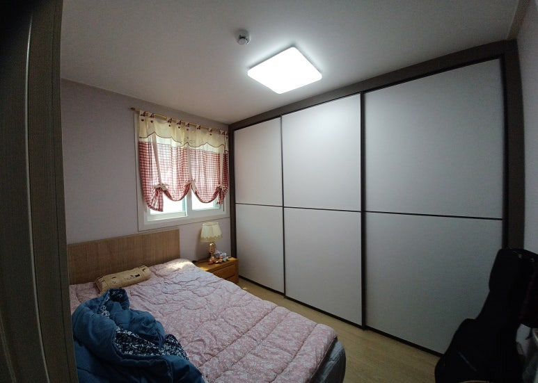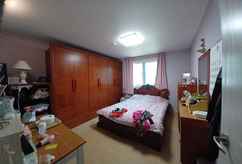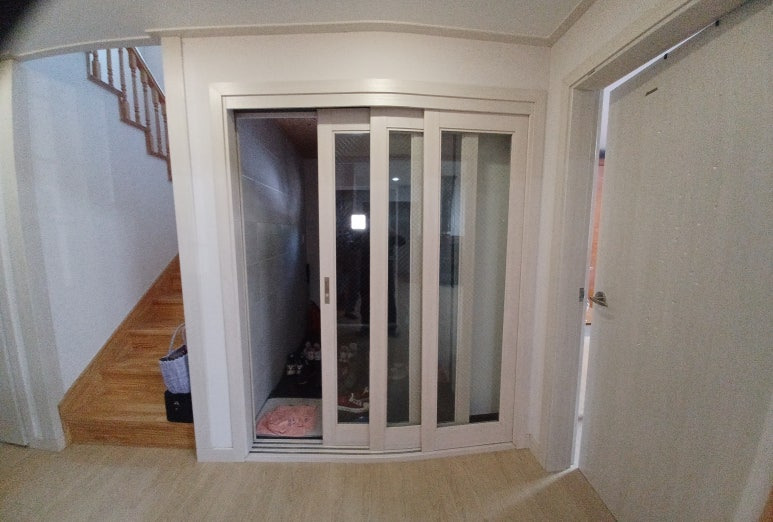 현관 슬라이딩 중문을 열고 들어서면 좌측으로 2층 계단이 보이고 그 우측에는 안방이 자리합니다