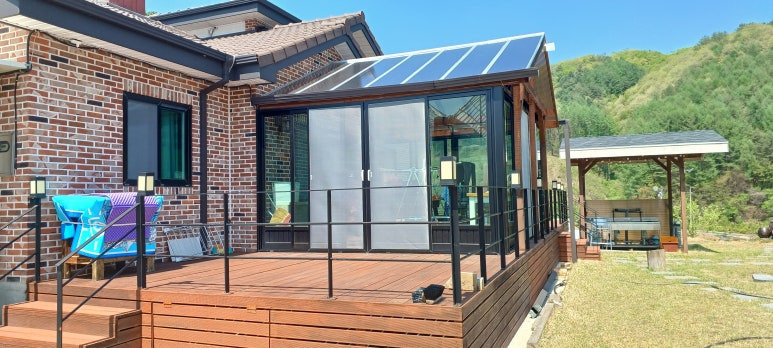 전원주택 거실앞 카페 분위기 테라스가 시설되어 있어 사계절 차한잔 술한잔의 여유를