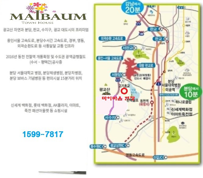 매물 사진 용인타운하우스 고기동 마이바움/전원주택 남판교 대장지구(수지 동천동)를 품고 있는곳. 생활편의와 자연환경을 함께 누릴 수 있는곳. " 마이바움 타운하우스 " 성남(분당)판교 대장지구 바로 앞에 들어서는 "마이바움 타운하우스"는 자연녹지지역으로 대지면적8848㎡(2676.52평) 건축면적 1390.59㎡(420.65평) 세대수 25세대의 프리미엄급 단독주택형 타운하우스로 건축되며 용서고속도로 서분당 나들목이 차로3분이면 이용 가능해 강남가지 약15분대 이면 도달할 정도의 위치에 지어집니다^^ 한 세대가 한 건물,개별정원을 사용하는 "마이바움 타운하우스"는 인테리어와 주변환경,편의시설등을 고루 갖추고 있으며 고기초등학교가 100m(도보2~3분)거리, 0,5km~4km 인근에 다수의 유아교육기관 및 학교 (고기초,한빛중,수지고) 수지와 분당 학원가도 가까워 교육환경이 매우 우수합니다^^ 서쪽으로 바라산(428m) 백운산(563m) 남쪽에는 광교산(582m)이 있는 자연환경울 갖춘 곳으로 판교 대장지구와 맞닿아 있는 "마이바움 타운하우스 " 판교신도시와 인접해 "미니판교"라고 불리는 성남 대장지구는 내년(2018) 공급을 앞두고 부지가 연이어 매각됨에 따라 사업이 속도를 낼 전망으로 판교신도시 수도권 집값 상승을 이끌어 온 "2기신도시"의 대표주자. 성남 대장지구는 91만 2255㎡규모 계획인구 1만5946여명(공동/단독주택 5903가구)으로 조성되는 미니신도시 입니다^^ 750개 기업이 입주해 4만3000여 명이 근무할 예정인 "판교 창조 경제밸리"의 배후지로 각광을 받을 전망입니다^^ 대장지구에서 서판교로 연결되는 터널 사통팔달 편리한 교통환경 할인마트,백화점,병원등 쇼핑,여가 문화공간이 자동차로 5분 이내 이용 가능해 지속적인 개발과 인프라확장으로, 전원주택지로의 선호도가 갈수록 높아지는것은 물론 토지 가격도 지속적으로 상승하는 곳으로 인기도가 급상승하고 있습니다^^ 마이바움 타운하우스는 목조가 아닌 철근콘크리트 구조이며 크게 두가지(A,B)타입으로 1층에 게스트룸/ 거실/ 주방으로 2층에 안방 / 아이방 3층은 다락방 / 테라스 1층에 방이 설계되어 노부모를 모시기에 아주 적합한 주택이 아닌가 싶네요^^ 내츄럴한 컬러를 기본으로 차분하고 모던한 스타일의 감각과 아트적인 이미지 불필요한 장식을 배재하고 간결하고 절제된 매스와 빛의 요소와의 조화 추구. 원목마루,독일 브랜드 주방가구 이건창호 등 최고급 인테리어 소재를 사용 합니다^^ 자연과 사람이 함께 숨 쉬는 공간 새로운 주거문화가 시작됩니다 !!! 단독주택의 독립성과 공동주택의 편리함이 공존하는 단독형 집합주택. 가족과의 행복한 생활을 존중하고 이웃과의 소통을 중시하는 인간 중심의 집 입니다. 거기에 자연의 숨결이 더해집니다^^ 보다더 궁굼하신 사항은 아래대표번호로 전화주시면 친절하고 자세하게 안내 도오드리겠습니다^^ 오시기전 전화주시면 명함문자 발송해 드릴께요^^ |