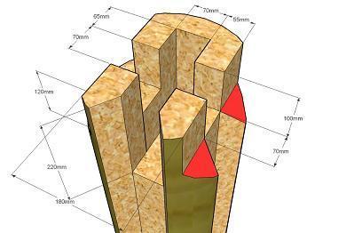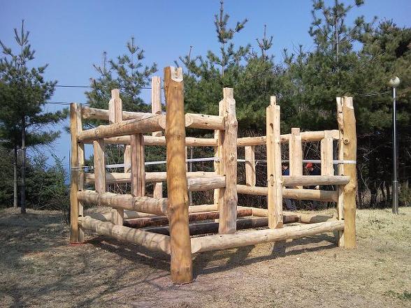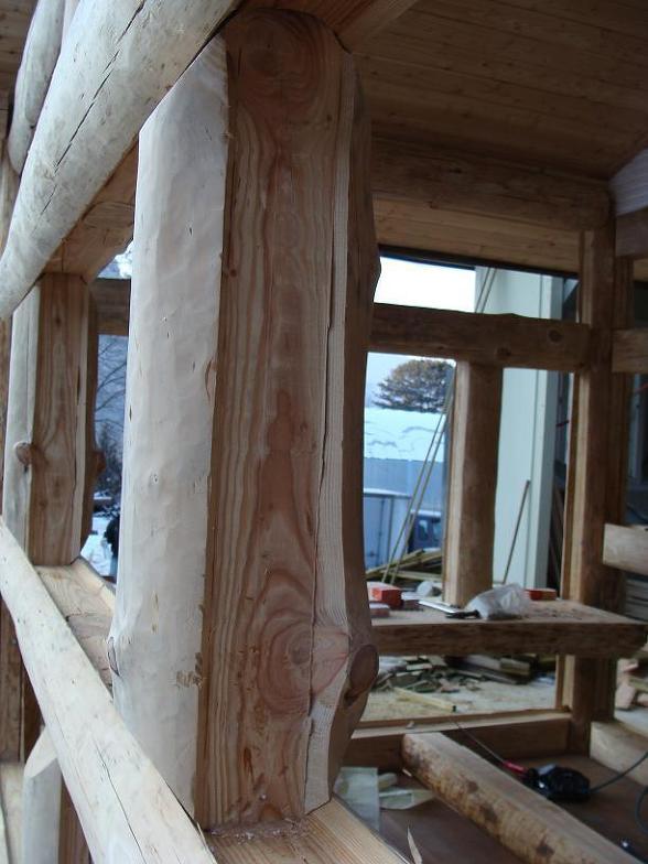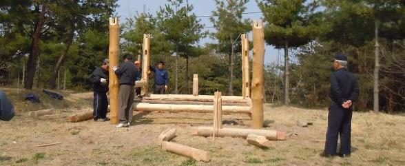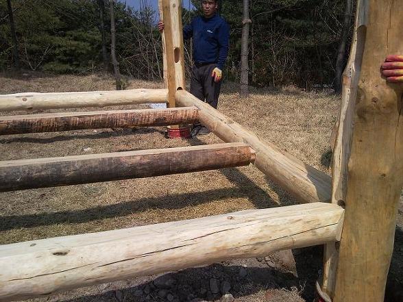 그 위에 굵으면서 똑바른 통나무는 옹이가 있는대로 수직 기둥을 만듭니다.