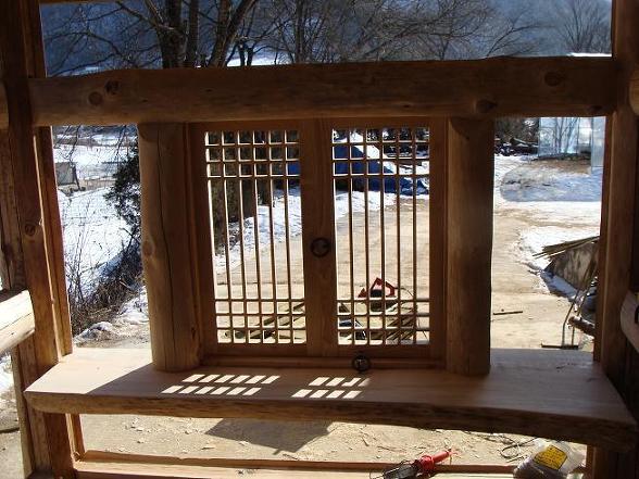 먼저 맨 밑둥은 굵지만 구부러진 그루터기를 잘라서 창틀밑에 쓸 판대기를 만들고,
