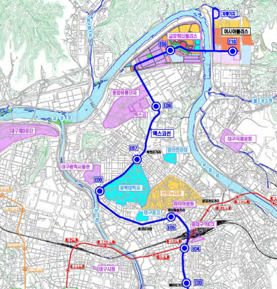엑스코선 노선은 동대구역-금호 워터폴리스를 잇는 엑스코선이
