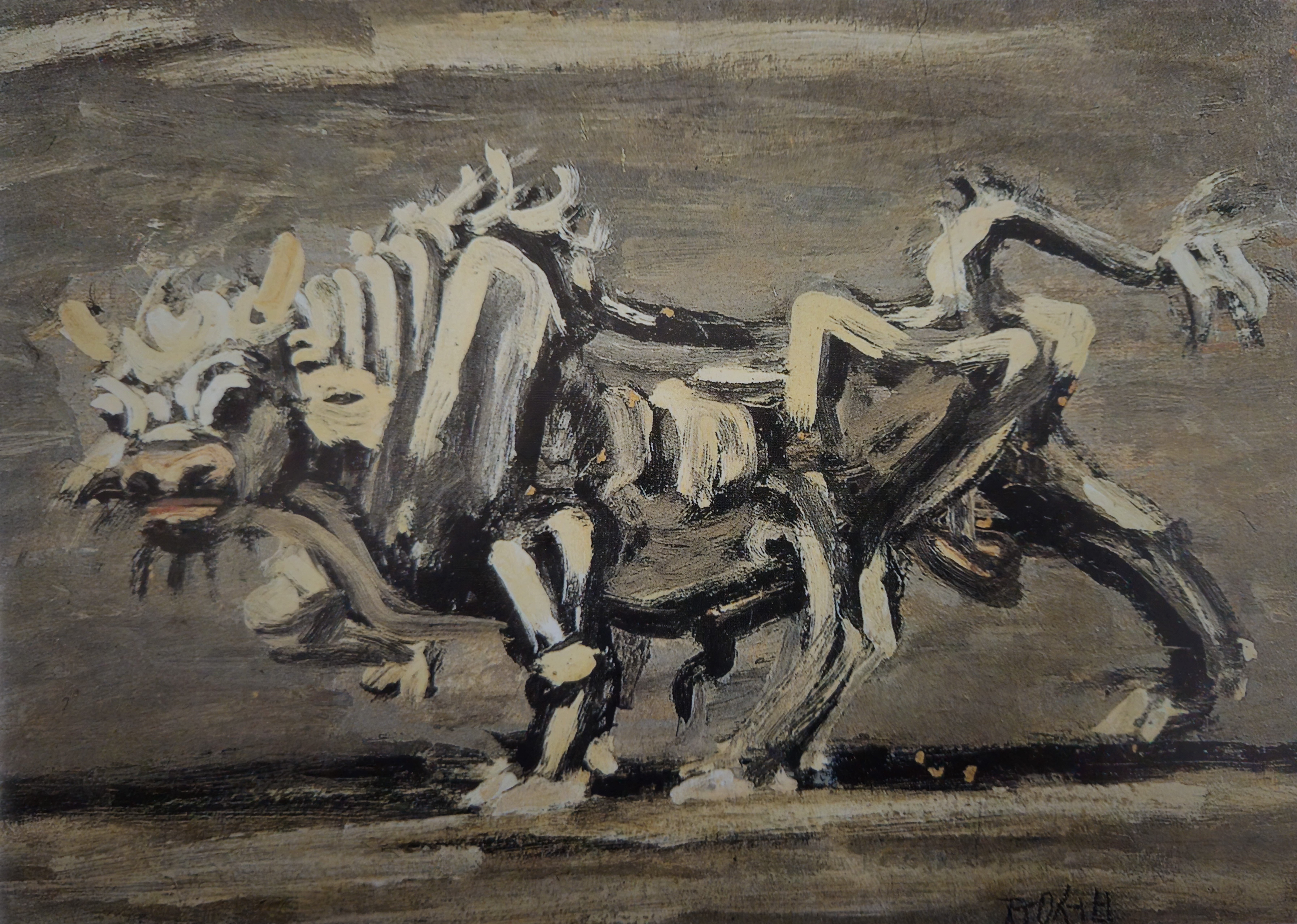 "대향(大鄕) 이중섭(李仲燮)"의 1953년 작품 "흰소". 1916년 평안남도 평원군 조운면 송천리에서 태어나 일본에서 유학을 하였으며, 6.25전쟁이 발발하자 1951년 1월초 원산을 떠나 서귀포로 피난을 내려와서 일본인 아내와 두 아들과 함께 1년정도 거주하면서 "서귀포의 환상"등 서귀포 시대의 명작을 남겼다. 1952년 아내와 두 아들을 처가인 일본으로 보내고 부두노동 등으로 생계를 이어가며 작품활동을 하던 중 주변에서 마련해준 선원증으로 1953년 일본으로 건너가 가족들과 상봉했으나 일주일 만에 귀국한다. 1953년 휴전이 있고난 후 이중섬은 경남 통영으로 가서 "흰 소", "충렬사 풍경", "통영 저수지" 등 100여점의 그림을 그린다. 1955년 미도파 화랑에서 개인전을 열었으나 작품도 잘 안팔리고 수금도 제대로 되지 않았다. 1956년 거식증 증세가 나타나고 영양부족과 간장염으로 9월 6일 서대문 적십자병원 무료병동에서 만40세의 나이로 쓸쓸히 마감한다. 대표작으로 1953년 그린 "흰소", "과수원의 가족과 아이들", 1954년 그린 "부부", "달과 까마귀" 등이 있다. 이중섭은 소를 잘 그리기 위해 늘 소를 관찰했다. 한번은 소를 그리려고 남의 집 소를 너무 열심히 관찰하다 그만 소 도둑으로 몰려 붙잡혀 간 적도 있었다. 이중섭이 일본 유학시 조선에서 온 유학생이 많았는데 대표적으로 동년배인 이쾌대, 진환, 최재덕 등과 교류하였으며 프랑스 화가 "조르주 루오"의 영향을 받았다.