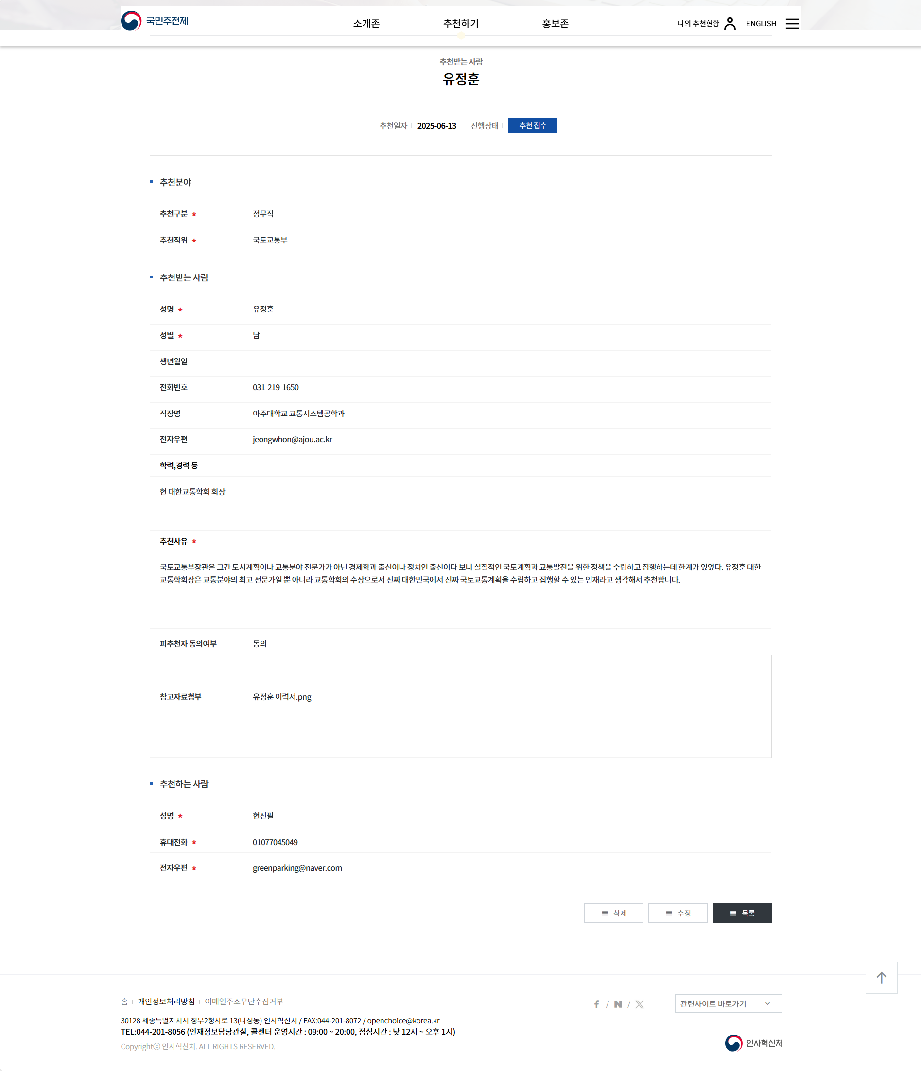 이에 교통분야에서 가장 대표성이 있다고 판단되는 대한교통학회 회장님이신 유정훈교수님을 다같이 추천했으면 합니다.