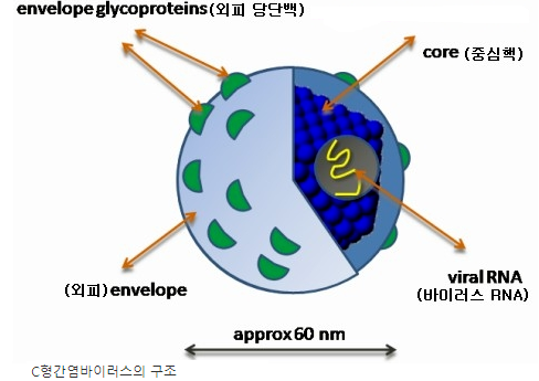 C형간염바이러스는 그 지름이 50nm인 구형 바이러스로서 외가닥사슬 모양의 RNA 바이러스입니다.
