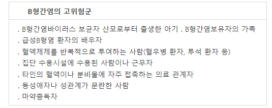 B형간염 예방접종은 그 효과가 우수하므로 접종 후 일일이 항체 형성 여부를 확인할 필요는 없으나 다음과 같은 B형간염의 고위험군에 해당하는 사람은 항체 형성 여부를 확인하는 것이 좋습니다.
