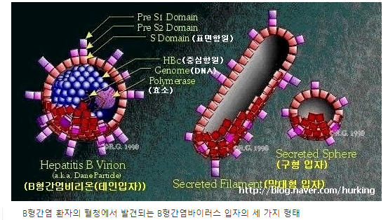 B형간염 환자의 혈청에서는 위 세 가지 형태의 바이러스 입자가 모두 발견될 수 있습니다.