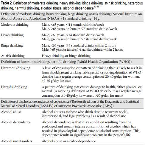과음을 지속하면 여러 가지 신체질환이 발생할 위험이 높으며, 이중 대표적인 신체질환이 알코올 간질환이다. 따라서 알코올 간질환을 예방하고 진행을 막기 위해서는 위험음주자를 선별하여, 적절하게 관리하고 치료하는 것이 무엇보다 중요하다. 일반적으로 위험음주자는 미국 국립 알코올남용 및 중독연구소(National Institute on Alcohol Abuse and Alcoholism, NIAAA)와 세계보건기구(World Health Organization, WHO)에서 사용하는 기준을 주로 이용하고 있으며, 음주량과 음주 습관에 따라 적정음주(moderate drinking), 과음(heavy drinking), 폭음(binge drinking), 위험음주(미국 NIAAA에서는 at-risk drinking, WHO에서는 hazardous drinking), 유해음주(harmful drinking) 등을 규정하고 있다(Table 2). 대부분 알코올사용장애 환자가 위험음주자에 포함되지만, 일반적으로 위험음주를 정의할 때는 알코올사용장애의 전(前) 단계를 말하며, 따라서 알코올사용장애가 아닌 경우로 국한하여 지칭하고 있다.