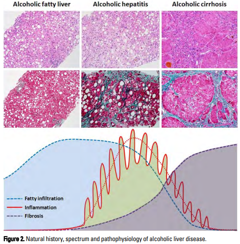 음주에 의해 발병하는 알코올 간질환은 지방간, 간염, 간경변증 및 간세포암의 다양한 범주(spectrum)를 포함하는 질환군으로, 간손상의 다양한 단계가 한 개인에 동시에 존재할 수 있다. 알코올 간질환에서 간섬유화의 발생 및 진행은 간경변증으로의 진행에 중요한 역할을 하며, 알코올 간질환의 조직학적 손상에 따라서 다양하게 나타난다(Fig. 2). 알코올 간질환 환자 727명을 평균 480일 추적 검사한 결과 사망률은 14.6%였고, 주 사망원인은 정맥류출혈(31.1%), 간부전(24.5%), 간신증후군과 패혈증(11.3%) 순이라는 국내 다기관 연구가 있지만, 아직 알코올 간질환의 자연경과는 명확하지 않다. 알코올 간질환이 어떠한 유형으로 나타나든지 단주는 질환의 진행을 막고 생존율도 향상시키며 간이식도 줄일 수 있으나, 5-15%에서는 단주를 하여도 간섬유화나 간경변증으로 진행할 수 있으므로 단주가 질환의 소실을 보장하지는 못한다.