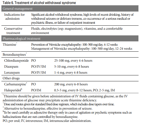약물로는 발작 예방을 위하여 작용 시간이 긴 benzodiazepine (예: chlordiazepoxide, diazepam)이 추천되며, 중추 신경계의 gamma amino-butyric acid (GABA)수용체를 활성화하여 불안 감소, 진정, 수면 효과를 보인다. 금단이 심한 환자, 노인, 최근의 두부외상, 간부전, 호흡 부전, 기타 심각한 내과 질환이 있거나 고도 비만인 환자는 작용 시간이 중간 정도의 lorazepam을 권장한다. Lorazepam은 하루 6-12 mg로 시작하며 금단 증상 소실 후 단기간 사용 후 감량하여 중단한다(Table 6).