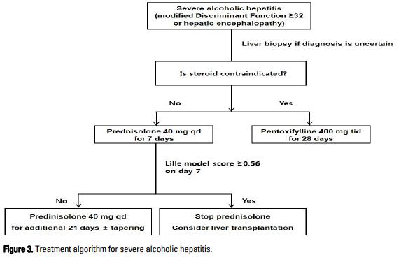 최근 스테로이드의 반응에 따라 예후를 예측하기 위해서 ECBL과 Lille model이 소개 되었다(Table 5). ECBL은 7일 째 빌리루빈이 치료 첫 날의 빌리루빈 수치보다 낮은 경우로 정의하는데 한 연구에서 ECBL이 확인된 중증 알코올간염 환자의 6개월 생존율은 82%인데 반하여 ECBL이 없는 환자에서는 23% 밖에 되지 않았다. 이후 소개된 Lille model은 ECBL에 몇 가지 변수를 추가하여 만든 개량형 모델이다. Lille model 점수는 사망 개연성을 0부터 1까지 범위로 잡는데 0.45를 넘는 환자에서는 6개월 생존율이 25%로 이를 넘지 않은 환자의 생존율보다 유의하게 낮았다. 또한 최근의 보고에서는 이를 좀 더 세분하여 Lille 점수 0.16 이하는 완전반응군, 0.16-0.56은 부분반응군, 0.56 이상은 무반응군으로 나누었고 이들의 28일 생존율은 각각 91.1%, 79.4%, 53.3%로 유의한 차이를 보였다. 특히 스테로이드에 반응하지 않는 환자에서는 경과 중 중증 감염의 빈도가 유의하게 증가함을 고려할 때, ECBL과 Lille model에 따라 스테로이드 무반응군으로 판단되는 경우 약제를 중단하는 것이 바람직할 것으로 생각된다. 이러한 환자에서 간이식을 시행할 경우 내과적 치료만을 지속한 경우에 비해 유의한 생존율 향상을 기대할 수 있다. 단, 이에 대한 사회적 합의가 필요하겠다.
