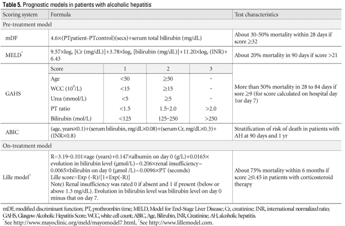 치료 전 예후평가를 위한 대표적인 모델로는 DF 점수, MELD (Model for End Stage Liver Disease) 점수, Glasgow 알코올간염 점수(Glasgow Alcoholic Hepatitis Score, GAHS)와 ABIC (Age, Bilirubin, INR, Creatinine) 점수들이 있다(Table 5).