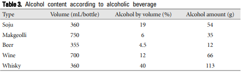 술의 종류, 음주량, 1주간 음주횟수, 음주기간에 대하여 자세히 확인해야 한다. 환자들이 음주 자체를 부정하거나 실제 음주량보다 줄여서 말하는 경우가 많아 설문지를 통하거나 가족이나 친지로부터 환자의 음주력에 관한 정확한 정보를 얻는 것이 도움이 된다. 아직까지 알코올 간질환을 일으키는데 필요한 최소 음주량에 대한 통일된 기준이 없고 개인차가 있지만, 하루 평균 알코올 섭취량이 남자에서 40 g 이상, 여자는 20 g 이상인 경우를 기준으로 삼는다. 하루 평균 알코올 섭취량은 마신 술의 양(mL)×술의 도수(%)×알코올의 비중(0.785)으로 계산한 1회 알코올 섭취량에 주간 평균 횟수를 곱한 값을 7로 나누어 구한다. 예를 들어, 19% 소주 1병(360 mL)을 1주일에 평균 3회 마신다면 [360 mL (소주 1병의 양)×19%(소주의 알코올 농도)×0.785(알코올의 비중)]÷100=53.694 g이 1회 알코올 섭취량이 되고 53.694×3÷7로 계산한 약 23 g이 하루 평균 알코올 섭취량이 된다. 술 종류 별 알코올 함량은 Table 3과 같다.