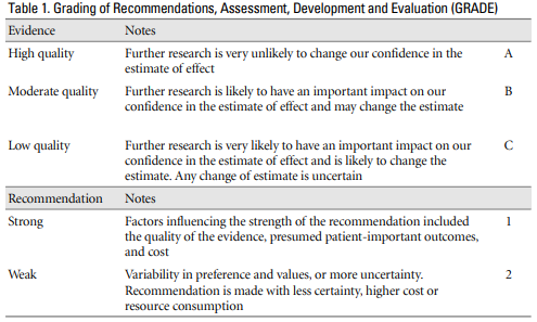 가이드라인의 근거수준과 권고등급은 아래와 같이 수정된 Grading of Recommendations, Assessment, Development and Evaluation (GRADE)에 의하여 분류하였다(Table 1). 근거수준은 현재까지의 근거로 해당 중재효과에 대해 확신하는 정도이며, 연구설계, 문헌의 질, 근거의 양, 근거의 일관성, 근거의 직접성을 고려하였다. 권고등급은 권고대상 환자에서 중재를 시행하였을 때 원하는 결과가 원하지 않은 결과보다 많은 것으로 확신하는 정도이며, 근거수준, 이득, 선호도, 비용 등을 고려하였다.