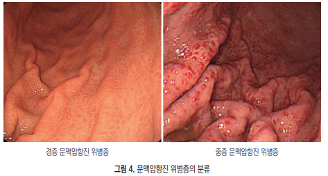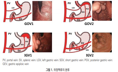 위정맥류의 분류는 식도정맥류와의 관계 및 위치에 따라 위식도정맥류 (gastroesophageal varices, GOV)와 단독 위정맥류(isolated gastric varices, IGV)로 나뉜다(그림 1). 위식도정맥류는 식도정맥류가 위의 소만을 따라 확장 된 경우(GOV type1, GOV1)와 위바닥(fundus)으로 확장된 경우(GOV type 2, GOV2)로 나뉘며, 단독 위정맥류는 독립된 정맥류가 위바닥에 위치한 경우 (IGV1)와 위 내 다른 부위 또는 십이지장 등에서 관찰되는 경우(IGV2)로 나뉜다. GOV1의 발생 빈도는 74%로 가장 많았다.