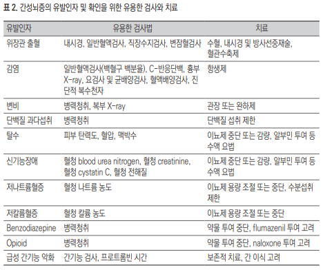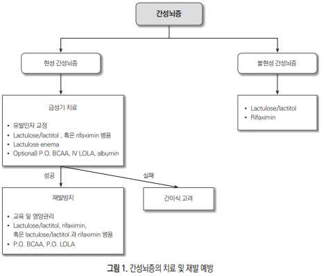 2. 불현성 간성뇌증 환자에서 인지기능과 삶의 질 개선을 위해 lactulose (B1) 또는 rifaximin (B2) 치료를 고려할 수 있다.