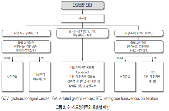 3. 출혈 위험이 높지 않은 작은 식도정맥류의 진행 예방을 위해 비선택적 베타차단제 (propranolol 또는 nadolol) 또는 carvedilol의 사용을 고려할 수 있다.