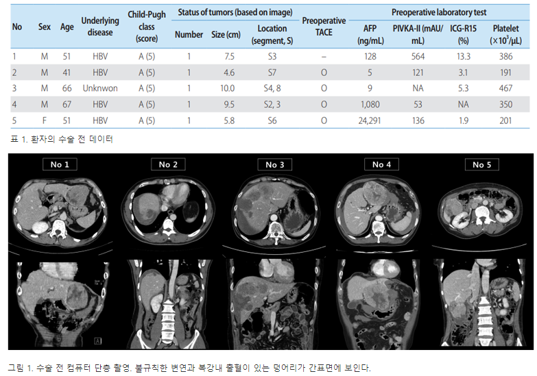 해당 기간 동안 본 기관에서 간세포암으로 간절제술을 시행 받은 환자는 총 128명이었으며, 이 중 파열 간세포암으로 수술 받은 환자는 5명(3.9%)이었다(Table 1). 4명(80%)이 남성, 1명(20%)이 여성이었으며, 수술 당시 환자들의 평균 연령은 55.2(±11.1)세였다. 3번 환자는 기저 간질환이 뚜렷하지 않았고, 나머지 모두(80%)는 B형간염을 가지고 있었다. 수술 전 영상 검사에서 환자들 모두 단일 간세포암을 가지고 있었고, 종양의 크기는 평균 7.5 (±2.3) cm로 최소 4.6 cm, 최대 10.0 cm였다(Fig. 1). 4명(80%)의 환자에서는 간세포암의 파열을 진단하자마자 경동맥 화학색전술(transarterial chemoembolization, TACE)을 통해 일차적인 지혈을 시도하였고, 안정기를 거쳐 정규 수술의 형태로 간절제술이 시행되었다. 반면 1번 환자의 경우, 파열이 처음 발견된 복부 전산화단층촬영(computed tomography)에서 이미 활동성 출혈이 없었고, 활력징후가 안정적이었기에, 색전술이 시행되지 않았으며, 며칠 뒤 정규수술의 형태로 간절제술이 시행되었다. 수술 직전 간기능은 모두 Child-Pugh 점수 5점으로 등급 A였다. ICG-R15은 1번 환자가 13.3%로 다소 증가되어 있었지만, 나머지 환자들은 모두 정상이었고, 혈소판감소증을 보이는 환자는 없었다. AFP는 5번 환자가 24,291 ng/mL로 가장 높았고, PIVKA-II는 1번 환자에서 564 mAU/mL로 가장 높았다.