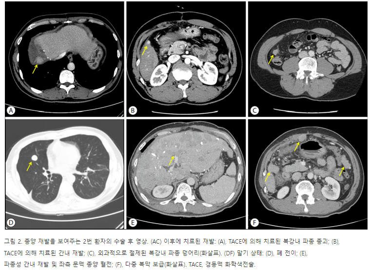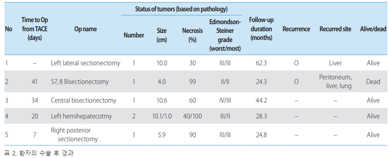 수술 전 TACE를 시행한 4명의 환자에서 수술은 TACE 후 짧게는 7일, 길게는 41일 후에 시행되었으며, 수술 후 환자들의 중앙 추적관찰 기간은 28.3(24.3-62.3)개월이었다. 환자들 모두에게 해부학적 간절제술이 시행되었다(Table 2). 추적관찰 기간 중 2명(40%)의 환자에서 재발이 있었으며, 재발 시기는 수술 후 1.9개월, 40.0개월이었다. 수술 후 1.9개월만에 재발을 한 2번 환자의 경우 처음 종양이 있던 부위에 인접한 횡경막에서 종양파종에 의한 것으로 보이는 재발이 처음 발생하였고, 이후 간 내 재발이 추가적으로 발생하였다. 이 병변들에 대해서는 TACE로 반복 치료하였고, 수술 후 13개월째 발생한 우하복부 복강 내 재발에 대해서는 수술적 절제를 시행하였다. 그럼에도 불구하고 간세포암이 간전체에 퍼지고, 다발성 폐전이, 문맥 종양 혈전, 복강 내 파종이 진행하여 수술 후 24개월 만에 결국 사망하였다(Fig. 2). 1번 환자는 수술 후 40.0개월 만에 처음 재발 병소가 발견되었다. 이전 수술부위와는 떨어진 6분절에 1 cm 크기의 간 내 재발이었고, 고주파 열치료로 치료하였다. 이후 13개월 뒤 다시 4분절에 또 다른 간 내 재발이 발생하여, TACE가 시행되었다. 두 차례의 재발 치료 후 8개월 동안 추가적인 병변발생 없이 추적관찰 중이다. 최종적으로 간절제술이 시행된 파열 간세포암 환자 5명 중 2명의 환자(40%)에서 추적관찰 중 재발이 발생하였고, 간세포암 파열에 의한 복강 내 파종은 한 명(20%)에서만 발생하였다. 그리고 복강 내 파종이 있었던 한 명(20%)만이 추적관찰 중 사망하였다.