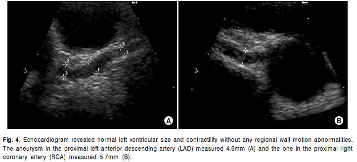 검사소견: 환아는 내원 당시 말초혈액검사에서 혈색소 10.4g/dL, MCV 57.7fL, MCH 17.9pg, MCHC 31.0g/dL, 백혈구 4,650/mm3(호중구 70%, 림프구 22%, 단핵구 6%, 호산구 1%, 호염기구 1%), 혈소판 205,000/mm3이었고, 화학검사상 AST/ALT 84/50IU/L, 총 빌리루빈 0.27mg/dL, LDH 762IU/L, ferritin 57.8ng/mL, 중성지방 190mg/dL이었다. C-반응성 단백질은 0.95mg/ dL이고 EBV IgG, EA IgG, EBNA IgG, EBV PCR은 양성이었다. 조혈모세포이식을 준비하기 위하여 시행한 심장 초음파 검사에서 좌우 관상동맥이 각각 4.6mm, 5.7mm로 늘어난 소견이 관찰되었으며(Fig. 4), 심전도와 흉부 방사선검사에서 특이소견은 없었다.