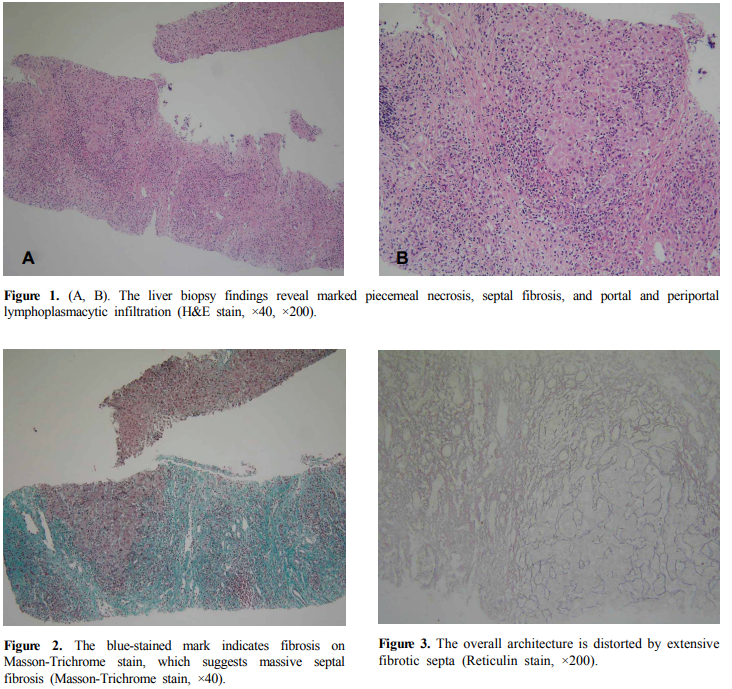 내원 8일째 시행한 간 조직 생검에서는 심한 문맥 주위 섬유화와 세포 주위 섬유화 소견, 간 소엽과 문맥 그리고 문맥주위 간 세포의 염증성 괴사가 관찰되어(그림 1A, 1B) Histology Activity Index by Knodell (HAI)는 총 15점이었다. Masson-Trichrome 염색에서는 중격 섬유화가 관찰되었으며(그림 2), Reticulin 염색에서는 reticulin 구조가 파괴되어 있었다(그림 3). 간 생검 조직에서 EBV 감염 유무를 확인하기 위하여 동소보합결합 검사(In Situ Hybridization)를 시행하였으며 림프구들에서 양성 소견이 관찰되었다(그림 4).