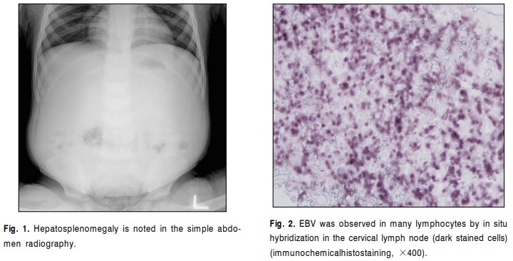 4세에 내원 전일부터 38.4℃까지 오르는 발열을 주소로 입원하여 시행한 말초혈액검사상 혈색소 9.3g/ dL, MCV 55.1fL, MCH 17.3pg, MCHC 31.4g/dL, 백혈구 5,670/mm3 (호중구 59%, 림프구 33%, 단핵구 6%, 호산 구 1%, 비전형림프구 1%), 혈소판 218,000/mm3 이었고, 직접/간접 Coombs’ 검사는 모두 음성이었으며 말초혈 액 도말검사상 저색소성 소적혈구 형태를 보였다. 혈 액화학검사상 AST/ALT 117/65IU/L, 총 빌리루빈 0.40 mg/dL, LDH 712IU/L이었고, C-반응성 단백질은 0.37 mg/dL, 혈청 철은 166μg/dL, 총철결합능은 348μg/dL 이었고, ferritin은 17.5ng/dL이었다. IgG/IgA/IgM 은 각 각 788/52/293mg/dL이었으며, HBs Ag/Ab, HAV IgM, HCV Ab는 모두 음성이었다. EBV IgG, EA (early antigen) IgG, EBNA (EBV nuclear antigen) IgG는 양성이 었으며, 자가 항체 중에서 항핵항체, 루푸스항응고인자, 항카디오리핀항체가 양성이었다. 흉부 단순 방사선검사에서 특이 소견 없었으며 복부 단순 방사선검사에서는 간비비대 소견을 보이고 있었다(Fig. 1). 골수 검사에서는 혈구탐식성림프조직구증의 소견은 보이지 않았으며 적혈구계열이 감소되어 있었다. 경부 림프절 조직검사에서는 림프구증식증과 불규칙한 모양의 과 증식성 여포가 관찰되었으며 많은 수의 림프구들에서 in situ hybridization 방법으로 EBV 감염을 증명할 수 있었다(Fig. 2). 혈액, 골수, 경부 림프절에서 EBV PCR (polymerase chain reaction)은 양성이었으며 흉부, 복부, 경부 전산화 단층촬영에서 다발성 림프절종대 소견이 관찰되었다(Fig. 3). 성염색체연관림프증식증후군과 감별하기 위해 시행한 SLAM(signaling lymphocyte activation molecule)-associated protein(SAP) 유전자 검사에서는 특이 소견 없었다. 환아는 면역글로불린 투여 후 호전되어 8병일에 퇴원하였다.