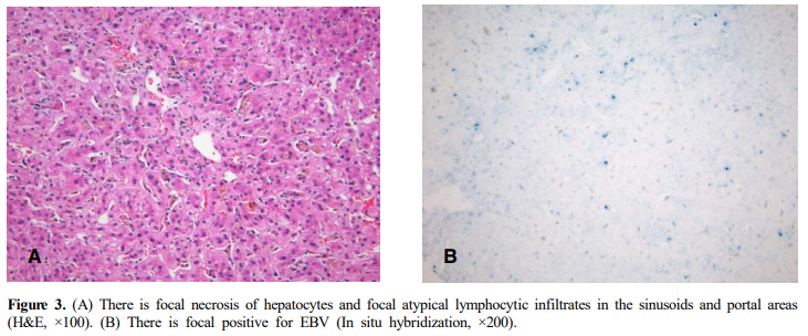 EBV의 감염 경로는 주로 타액에 의한 경구 감염이나 긴밀한 접촉과 수혈과 같은 비경구적인 경로로 전파 될 수 있다. 잠복기는 4주에서 7주이며 소아기에 감염되면 대부분은 무증상이지만 청소년기에는 25~75%에서 급성 전염성 단핵구증을 초래한다. 청소년기에 감염시 급성 전염성 단핵구증은 악성 삼출성 인후염, 전신적인 임파절 종대, 발열이 특징적으로 나타나지만 성인에서는 발열, 우측 상복부의 불쾌감이 주된 임상증상이며, 삼출성 인후염이나 임파절 종대 등은 현저하지 않다는 보고가 있다. 본 증례의 경우 전형적인 전염성 단핵구증의 증상를 보이지 않았고 간염의 비특이적인 증상인 전신쇠약감, 피로감을 주소로 내원하였다. 간과 연관된 EBV 감염의 발현 양상은 다양한 임상적, 조직학적 소견을 보여 단순한 간염에서부터 림프구 증식질환, 림프종 등이 발생될 수 있다.