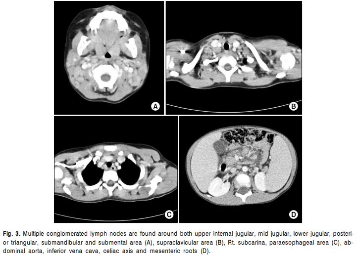 진찰소견: 입원 당시 혈압 127/91mmHg, 체온 37.3℃, 맥박수 136회/분, 호흡수 28회/분이었다. 몸무게는 16.8 kg(25~50 percentile), 키 98.6cm (10~25 percentile), 머리둘레 51cm(50~75 percentile)이었고 계통 문진상 환아는 전반적으로 기운이 없어 보였으며 간헐적인 발열과 식욕부진이 있었다. 이학적 소견상 인후부 발적이나 편도비대는 없었고 양쪽 경부에 다발성의 림프절 종대가 있었으며, 고정되어 있고 압통은 없었다. 흉곽은 대칭적 팽창을 보였으며 폐음은 깨끗하였고 심음은 규칙적이었다. 복부는 부드러웠으며 간과 비장이 각각 4횡지, 3횡지로 촉지되었으며 만져지는 서혜부 림프절은 없었다.