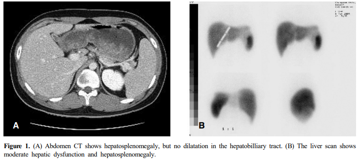 방사선 소견 : 흉부사진은 정상이었고, 복부 초음파검사 및 복부 컴퓨터 단층 촬영상(그림 1A) 간과 비장의 종대는 있었지만 담도계의 확장은 없었으며, 간스캔(그림 1B)에서는 간비종대 및 중등도의 간기능 장애가 있었다.