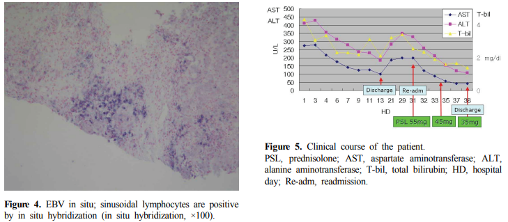임상경과 : 입원 4일째 시행한 검사상 혈청 Ceruloplasmin 40 mg/dL, 24시간 소변내 구리의 양은 40 μg/day로 정상이었다. 안과적 검진에서 Kayser-Fleisher ring은 관찰되지 않았다. EBV에 대한 혈청학적 검사상 IgM anti-EBVVCA은 양성이었고, IgG anti-EBV-VCA, IgG anti-EBNA, IgM anti-EBV-EA, IgG anti-EBV-EA, EBV-nested-PCR 정성 검사 모두 음성이었으며, anti-nuclear antibody, anti-smooth muscle antibody, LKM-1 antibody, anti-mitochondrial antibody도 음성이었다. 환자는 입원 3일째부터 ALT와 AST가 감소하였고 GGT는 7일째부터 감소하기 시작하였으나 총 빌리루빈은 점차로 증가하여 90일째에 혈중 농도가 21 mg/dL로 최고치에 오른 후에 감소하기 시작하였다(그림 2). 프로트롬빈 시간은 입원 26일째 1.5 INR로 증가하기 시작하여 70일 째 2.6 INR까지 상승한 이후 감소하기 시작하여 80일째 1.0 INR로 정상화되었다. 입원 56일째에 시행한 EBV에 대한 혈청학적 추적검사에서 IgM anti-EBV-VCA는 음성으로 전환되었고, IgG anti-EBV-VCA은 양성이었다. 환자는 121일째 시행한 경피적 간생검상 조직에 대한 동소보합결합(그림 3A, 3B)을 통하여 EBV에 의한 간염을 확인할 수 있었다.