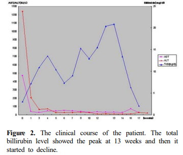 치료 및 경과 : 환자는 대증적인 치료를 통하여 자연회복 되었고 퇴원 후 3주째 및 11주째에 시행한 간기능 검사에서 모두 정상범위를 유지하였다.