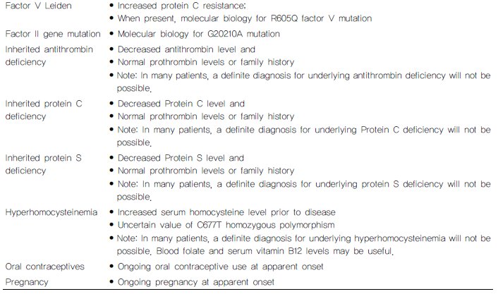 (c) 다른 원인이 배제되기 전까지는 상대적으로 혈전 발생을 잘 일으키지 않는 제5혈액응고인자 Leiden 돌연변이, 프로트롬빈 유전자 돌연변이, 고호모시스테인혈증(hyperhomocysteinemia) 또는 경구용 피임약 등을 유일한 위험요소로 고려해서는 안된다(Class I, Level B).