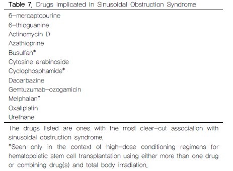 5. 광범위한 간섬유화, 바이러스성 간염, 골수외 혈구생성이 있는 골수섬유화증, 최근 gemtuzumab-ozogamicin 치료를 했거나 이전에 SOS가 있는 환자에서 간독성이 적은 약제를 선택하라. 간독성이 적은 전처치법은 경감된 강도의 화학요법, 시클로포스파미드가 없는 전처치와 전신 방사선투여량의 감소이다(ClassI, Level B).