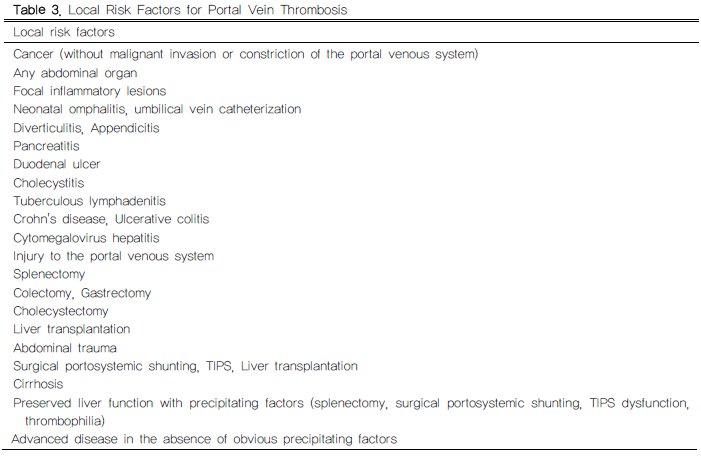 국소 위험인자는 표 3과 같다. 보통 간문맥 침습이나 협착없이 간문맥 분지 내 악성종양과 간경변증이 PVT의 주요한 국소위험인자다. 나머지 환자에서 PVT의 가장 흔한 국소위험인자는 복강 내 염증성 병소이다. PVT의 국소위험인자는 만성인 경우보다 급성일 때 잘 진단된다.