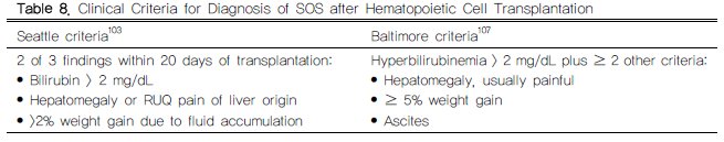 시애틀과 발티모어의 연구자들이 임상 진단기준을 제안하였다(표 8). 시애틀 진단기준은 이식 후 20일 이내에 다른 원인 없이 아래 3가지 중 2가지 이상의 소견을 보일 때이다: 다른 원인이 배제되며 총 빌리루빈>2 mg/dL, 압통을 동반하는 간비대, 수분 축적으로 인한 체중 증가 2% 이상. 발티모어 진단기준은 다른 원인이 배제되고 고빌리루빈혈증 >2 mg/dL가 반드시 있어야 하며 다음 3가지 중 2가지 이상이다: 종종 통증을 동반하는 간비대, 체중 5% 이상 증가, 복수. 이런 임상진단기준이 얼마나 신뢰할 만한지에 대한 연구에서 이식 100일 내 사망한 환자를 대상으로 간손상이 있었던 환자의 50%는 시애틀 진단기준에 부합하지 않았지만 부검에서 SOS에 합당한 소견을 보였으며,102 이는 간독성 전처치를 시행받은 환자의 대부분은 SOS의 특징적인 증상이 없을지라도 어느 정도의 간동양혈관손상이 있음을 시사한다.