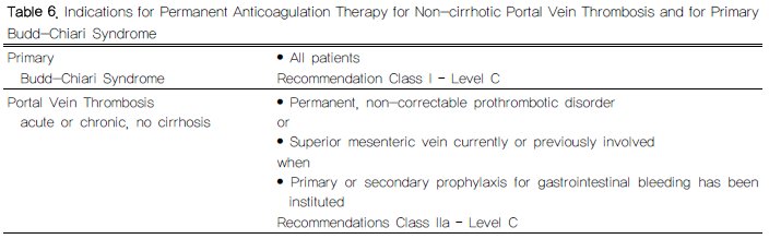 11. 금기가 없다면 급성 PVT와 원위부로 장간정맥까지 퍼진 혈전을 가진 환자는 장기간 항응고치료를 고려하라(Class IIa, Level C).