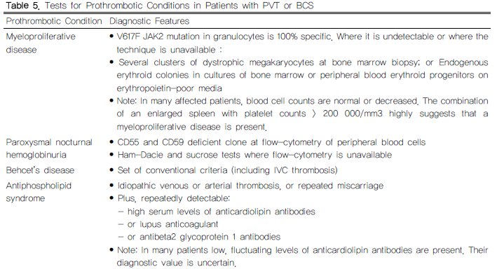 2. 진행성 간경변증나 암이 없는 경우 표 5에 나열된 혈전에 대한 다발성, 동시성 위험인자를 확인하라(Class I, Level B).