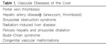 간질환은 실질성 질환, 간담도성 질환과 혈관성 질환으로 구분할 수 있다. 간경변증이나 간세포암종 환자의 간문맥 혈전증을 제외하고 대부분의 경우 간의 혈관성 질환은 흔하지 않기 때문에 임상에서 간과되기 쉽다(표 1). 간의 주요 혈관계는 간문맥(portal vein), 간동양혈관(hepatic sinusoid), 간정맥(hepatic vein), 간동맥(hepatic artery)로 구성된다. 장간동맥으로부터 유입된 대부분의 혈류는 간문맥을 통해 간으로 들어가 간동양 혈관을 거쳐 간정맥을 통해 유출되며 이러한 간혈류 순환장애가 생기면 심각한 간손상을 야기하거나 문맥압 항진증을 유발할 수 있다. 따라서 간의 혈관성 질환은 적절한 진단과 치료가 이루어지지 않거나 불필요한 조치로 유의한 이환율과 사망률을 초래할 수 있다.