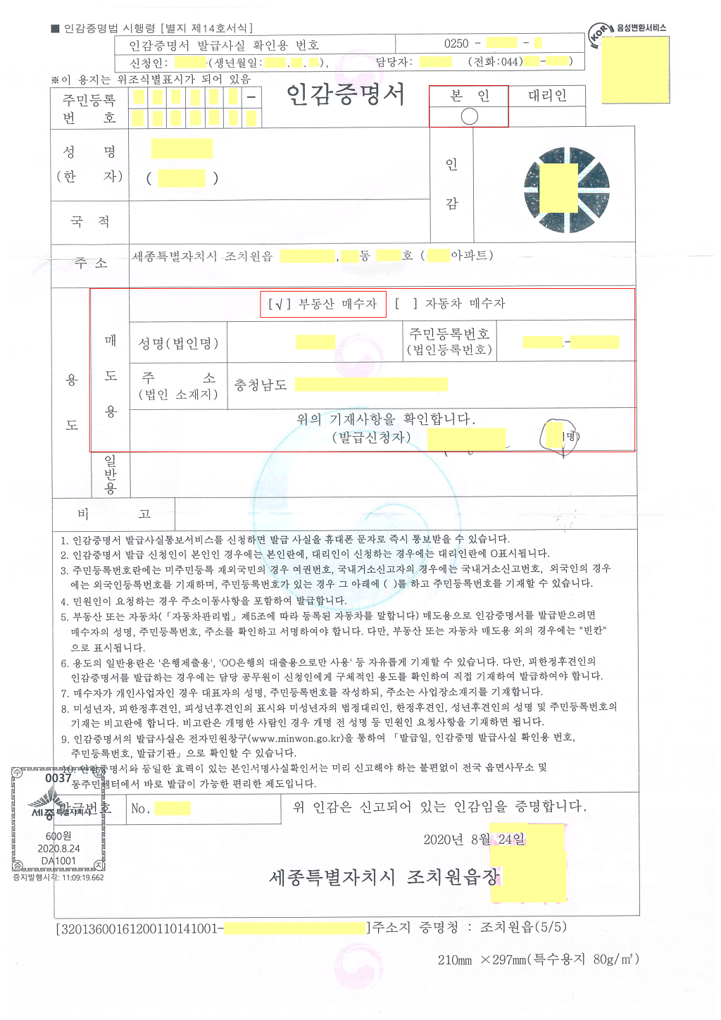 부동산매도용 인감증명서(부동산 매수자란에 매수인의 성명, 주민등록번호, 주소 기재요)