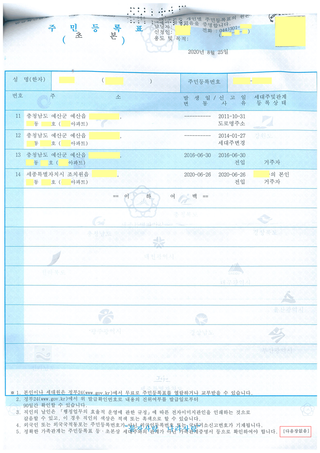주민등록초본1(주소변동사유가 나오는 것)