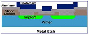 금속에칭은 소자의 전도회로의 길을 남겨놓기 위해 선택적으로 알루미늄층을 제거한다. 이 과정은 노출된 포토레지스트의 패턴에 남겨진 금속을 정교하게 제거해야만 한다. 동시에 남아있는 회로의 면들이 잘라내지는 것을 피해야 한다.