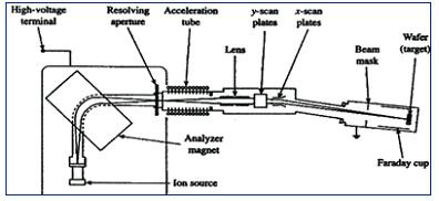 간결화된 이온주입시스템의 모형도는 위 그림과 같은데 바람직한 불순물이 이온들은 그림에서 맨 끝에 보여지는 이온 소스에서 생산된다. 이온빔은 미리 맞추어진 동작전위로 가속되고 초덤이 맞추어져 최종적으로는 웨이퍼의 표면위로 주사된다. 주사는 웨이퍼를 기계적으로 움직이거나, 정전계적으로 혹은 두 가지 방법의 조합으로 이루어 지는데 웨이퍼로의 전기적인 접촉은 주입된 이온을 중화하기 위한 전자의 흐름을 허용한다