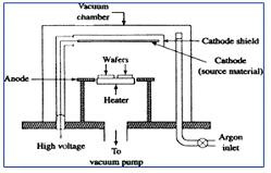우선 플라즈마를 생성하기 위해 아르곤(Ar)가스 분위기에서 캐소드 쉴드를 사용한다. 소스 물질과 기판은 그림에서와 같이 고전압 전원에 연결된 반대편의 평행판 위에 놓여지게 되는데 증착되는 과정은 먼저 챔버를 진공으로 만든 다음 낮은 압력의 스퍼터링 기체, 보통 아르곤을 챔버내로 흘려주게 된다. 전극에 전압을 가해주게 되면 아르곤기체(Ar+)를 이온화하게 되고 플레이트 간에 플라즈마가 발생합니다. 소스 물질로 덮여있는 플레이트는 기판에 비해 음전위로 유지되므로 아르곤 이온은 소스물질이 덮여있는 플레이트로 가속되게 되는데 아르곤 이온의 충격으로 소스원자와 분자들은 플레이트로 부터 방출되어 웨이퍼로 날아가 증착이 되는 원리이다.