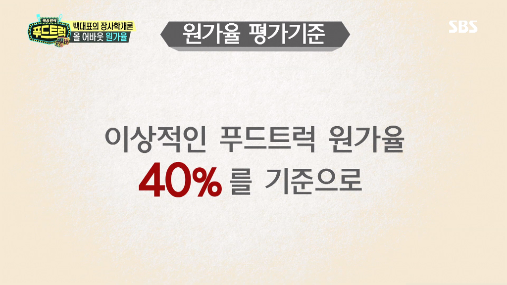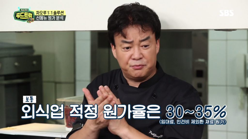 식당 음식점 재료 원가율 30%~35% (임대료,인건비 제외한 재료원가) - 백종원의 푸드트럭 차오루 1:1 솔루션 작성자ROK Ju.|작성시간17.08.26|조회수445 목록 댓글 0 글자크기 작게가 글자크기 크게가 다음검색 현재 게시글 추가 기능 열기 북마크 공유하기 신고 센터로 신고 댓글 댓글 0 댓글쓰기 답글쓰기 댓글 리스트