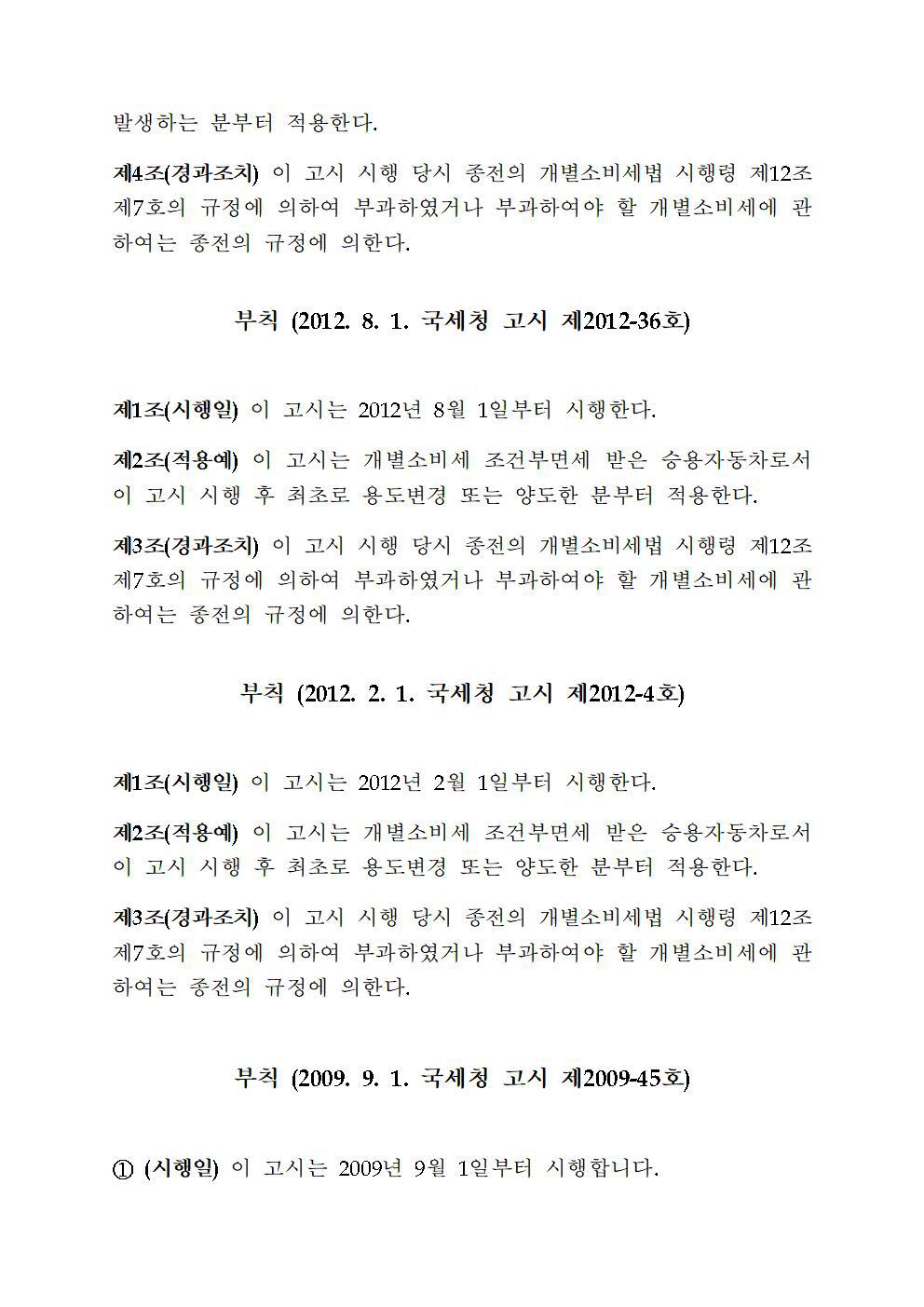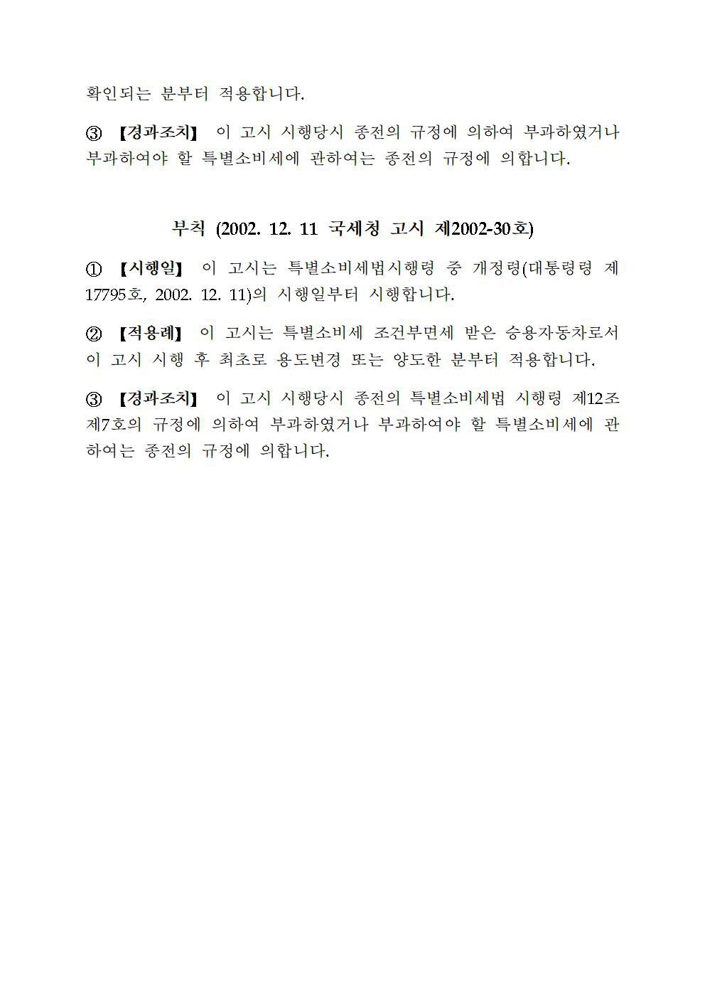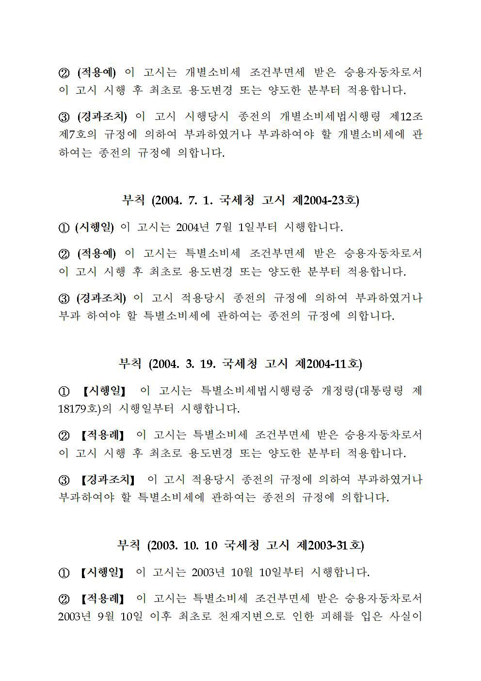 제3조(적용예외) 다음 각호의 경우 이 고시를 적용하지 않는다. 1. 개별소비세법 제18조제1항제3호에 해당하는 조건부면세 반출 승용자동차로서 반입자가 반입지에 반입한 사실 및 용도증명서를 제출하지 않은 경우 |