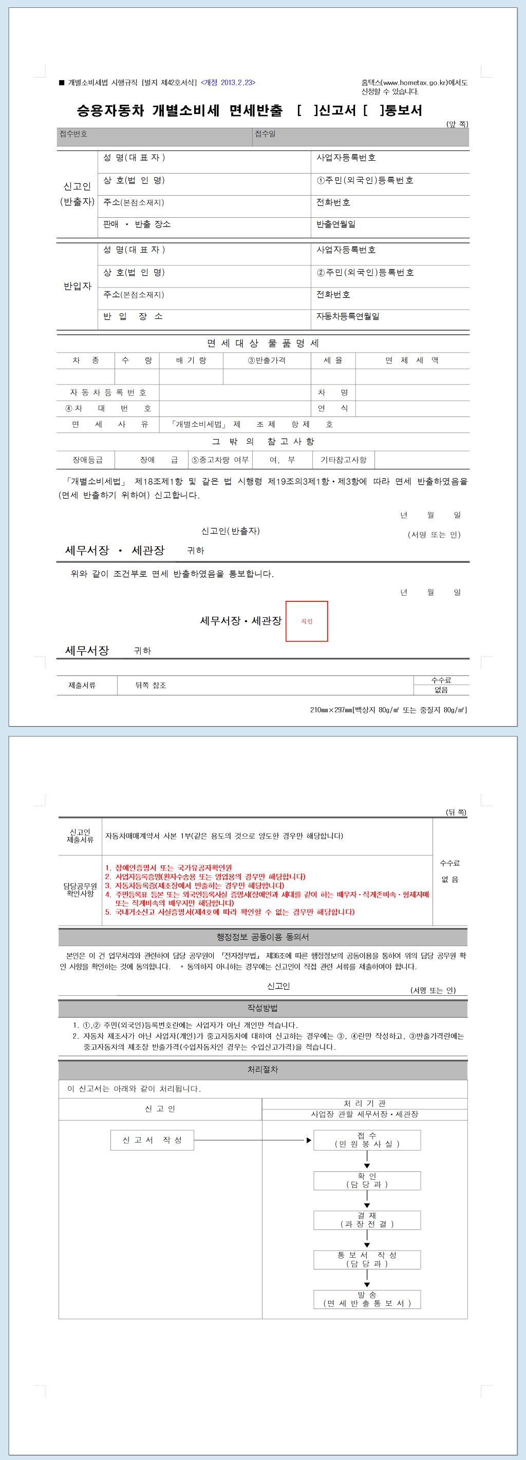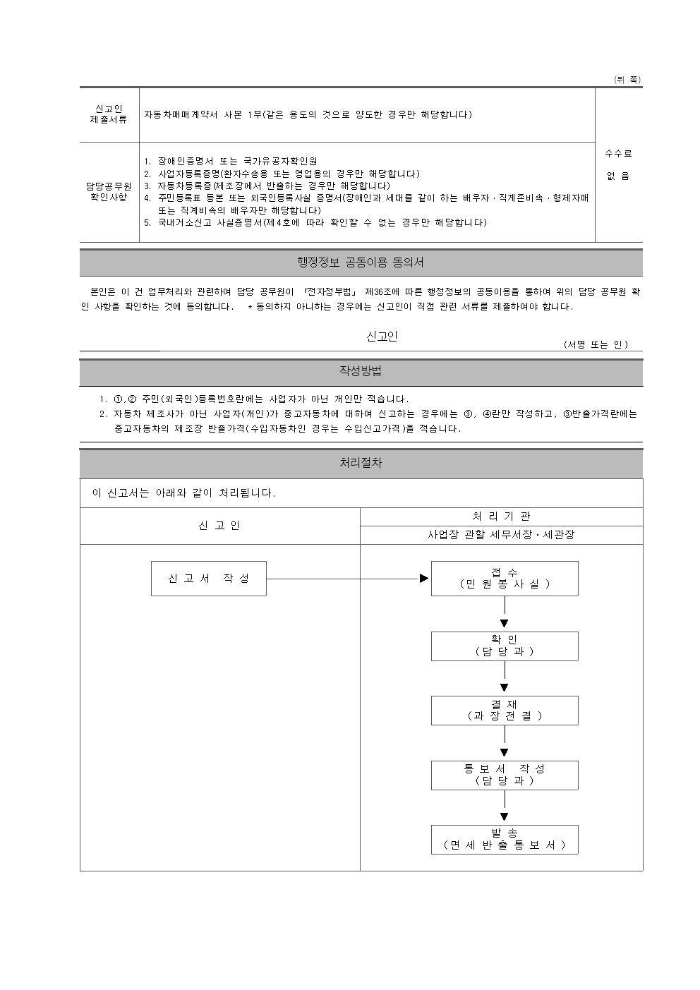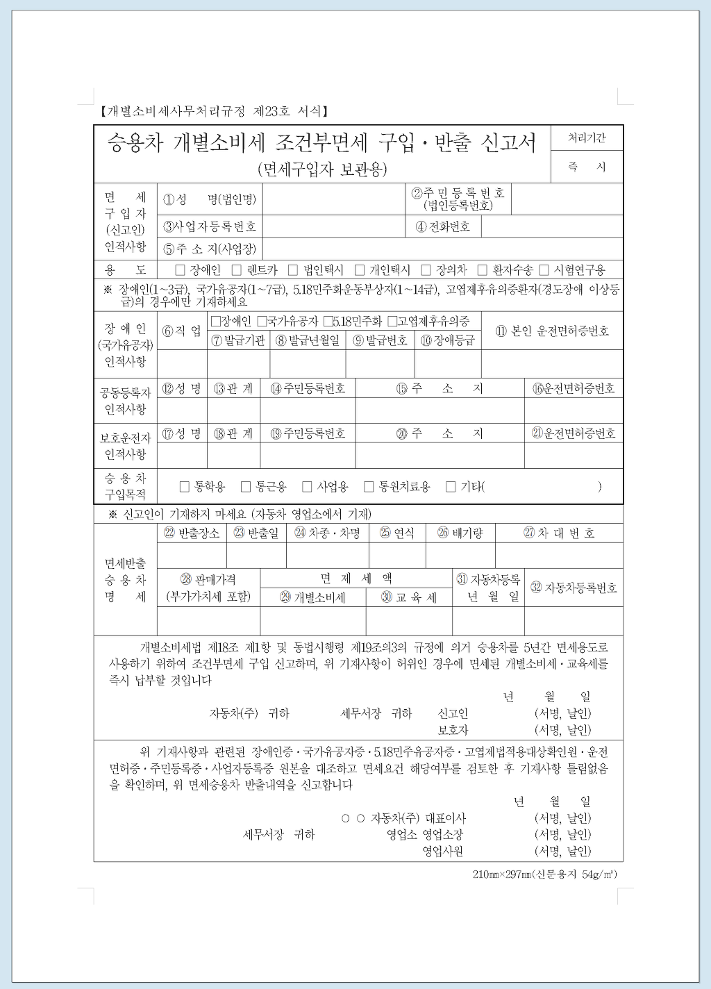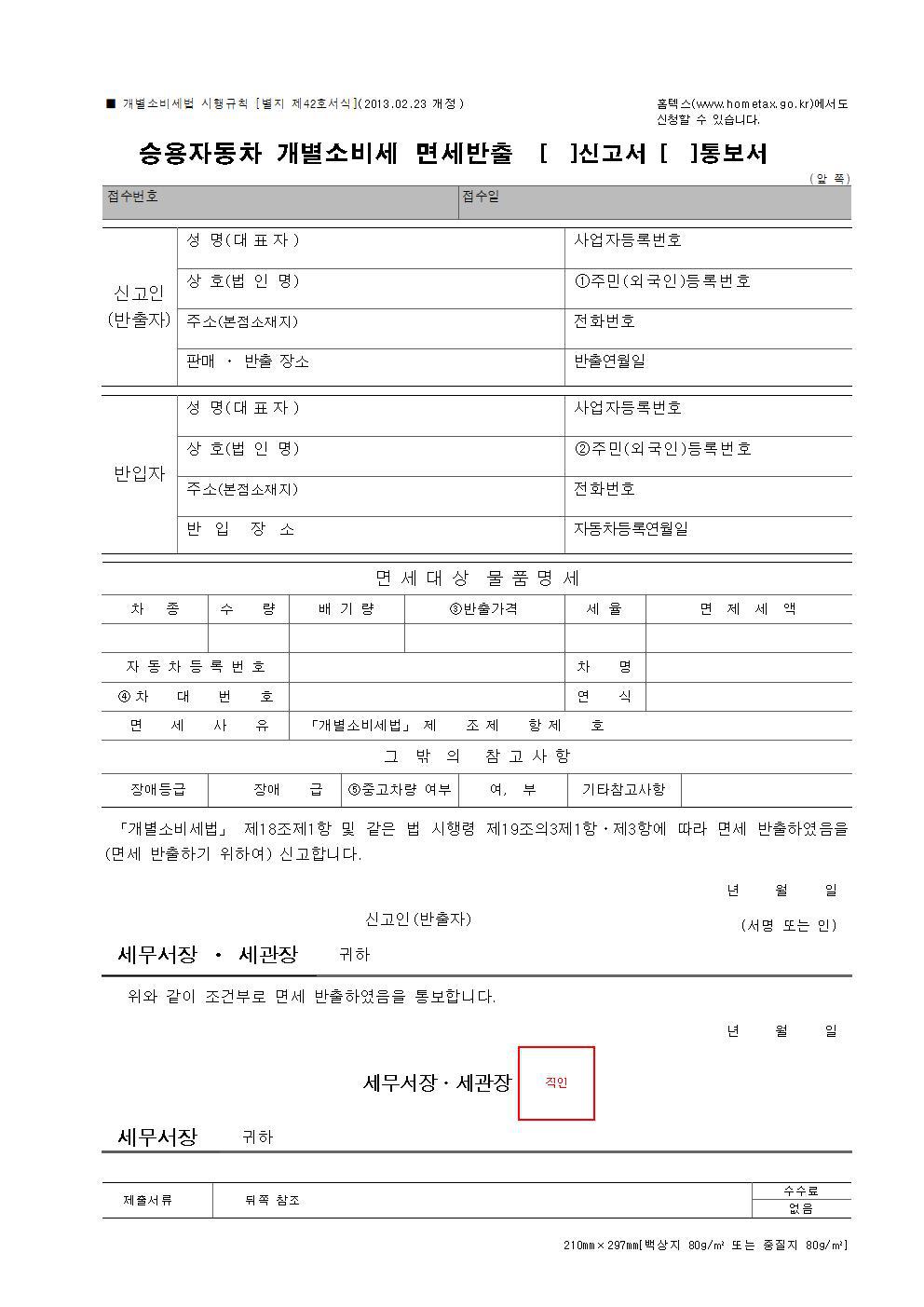 (2) 면세조건에 해당하는 사람(장애인, 개인택시 등)에게 면세용도로 다시 양도(판매)한 경우 : ①「승용자동차 개별소비세 면세반출 신고서(시행규칙 별지 제42호 서식)」와 증빙서류를 재반출한 달의 다음달 말일까지 ②개별소비세 과세표준신고서(시행규칙 별지 제6호 서식)와 같이 제출하여야 개별소비세 등을 징수하지 않습니다.