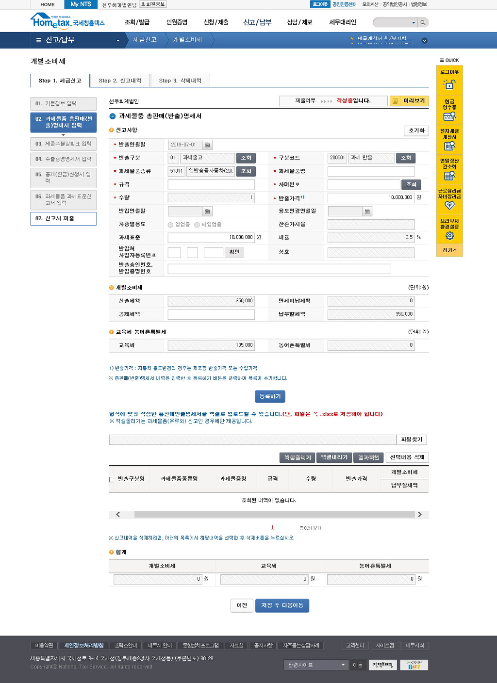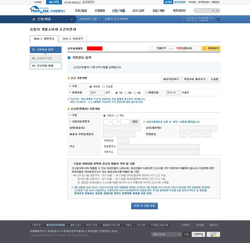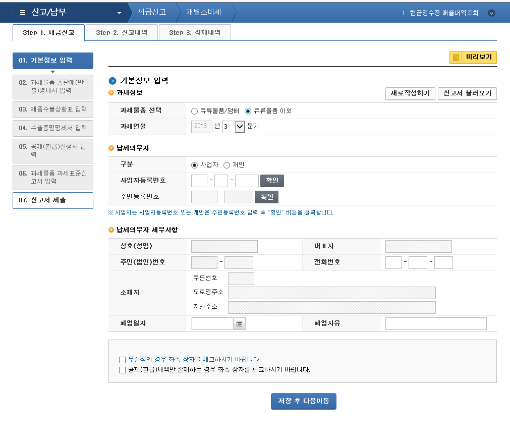 - · [STEP 1. 일반신고] 과세자료 작성 및 제출 단계입니다.