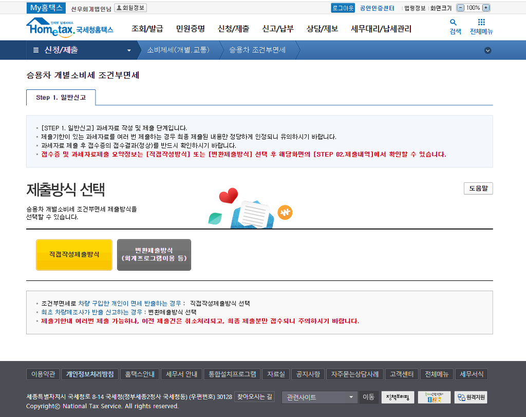 승용차 개별소비세 조건부면세 제출방식을 선택할 수 있습니다.