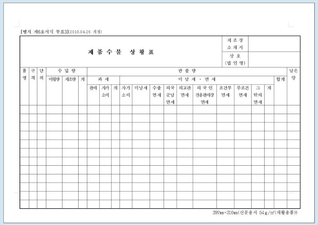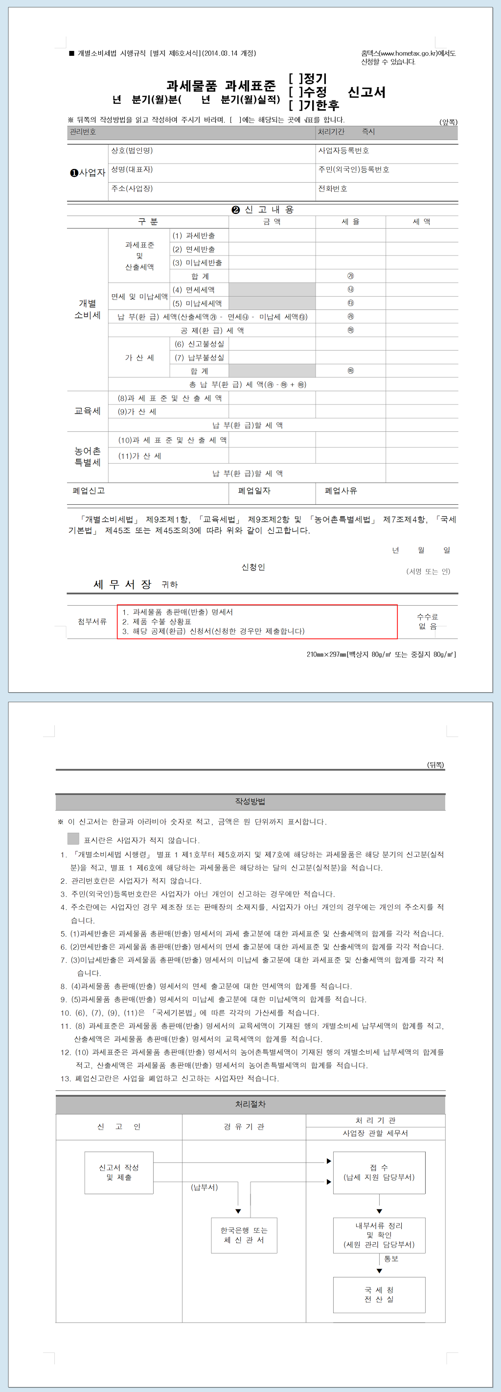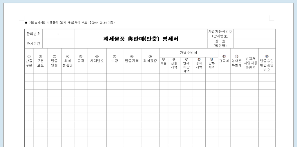 물품은 매월) 판매장에서 판매하거나 제조장에서 반출한 물품의 물품별 수량, 가격, 과세표준, 산출세액, 미납세액, 면제세액, 공제세액, 환급세액, 납부세액 등을 적은 신고서(개별소비세법 시행령 제15조 [ 과세표준의 신고 ]]를