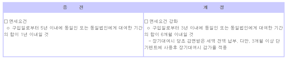 제3조(적용예외) 2. 최초 반입일로부터 3년이내 동일인 또는 동일법인에 대여한 기간의 합이 6개월을 초과하는 경우. 다만, 동일인 또는 동일법인에게 최초 대여한 일자가 반입일로부터 3개월을 초과한 경우 이 고시를 적용한다 |